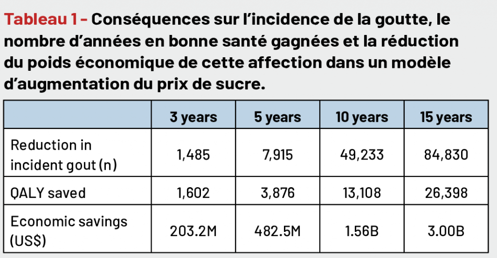 Une augmentation de 20 % du prix du sucre sur 15 ans permettrait de diminuer de 84 830 cas de goutte incidente, ce qui correspondrait à un gain de 26 398 années de vie en bonne santé et une économie de 3,15 milliards de dollars (Tab. 1).
