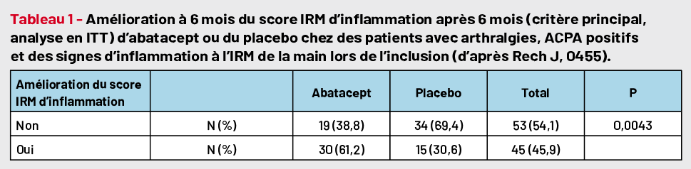 Des essais de traitement préventif de la polyarthrite rhumatoïde (PR) sont en cours. Cette approche vise à traiter les patients avec une symptomatologie clinique à risque d’évoluer vers une PR. L’essai PRAIRI a été présenté à l’ACR en 2017 et est publié (1). Cet essai montre un effet de ralentissement des formes précliniques de PR vers une PR établie après une perfusion unique de rituximab. L’essai ARIAA s’intéresse à des patients avec arthralgies, des anticorps ACPA positifs, des signes d’inflammation en imagerie IRM (IRM main dominante) et qui sont à haut risque d’évoluer vers une PR (antécédent familial). Cet essai a évalué l’effet de l’administration d’abatacept (ABA) (125 mg/sem SC) versus le placebo (PBO) pendant 6 mois avec une phase de suivi pendant 12 mois. Le critère principal d’évaluation était l’imagerie IRM (réduction de l’inflammation selon le score RAMSIS). Cent patients étaient randomisés avec une évaluation sur 98. Soixante-et-un pourcent des patients du groupe ABA avait une amélioration d’au moins un des paramètres IRM d’inflammation (synovite, ténosynovite, ostéite) comparativement à 31 % dans le groupe PBO (p = 0,0043) (Tab. 1).
