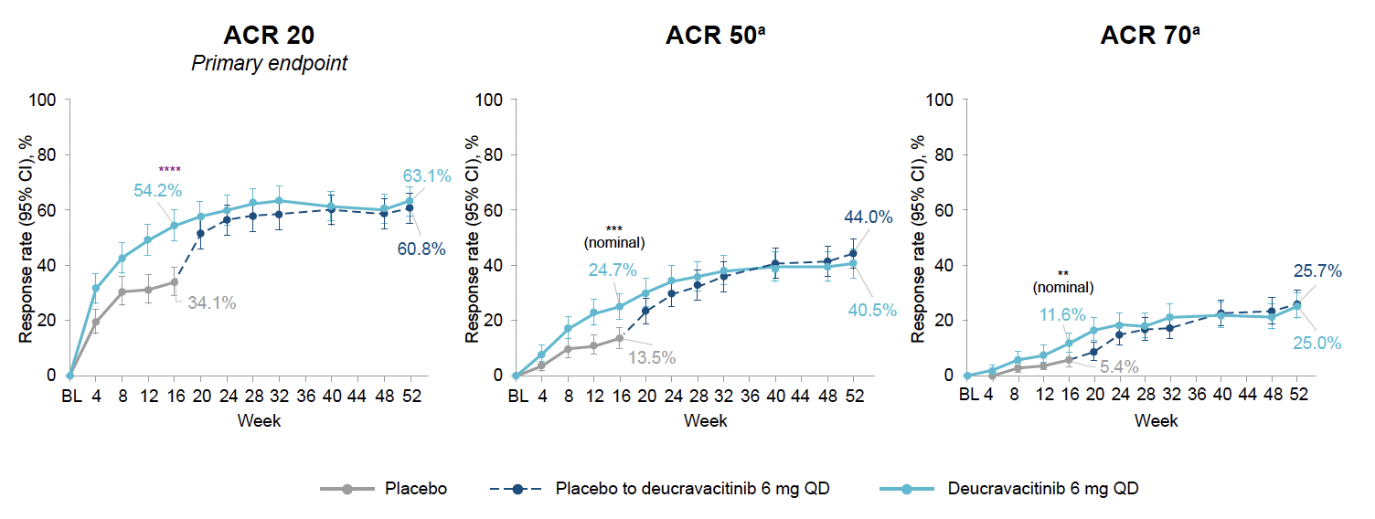• Van Der Heidje D et al. Efficacy and safety of deucravacitinib up to week 52: a multicenter, randomized, double-blind, placebo-controlled, phase 3 study in patients with active psoriatic arthritis who are naive to biologic disease-modifying antirheumatic drugs. ACR 2025 ; Abst. LB20.
