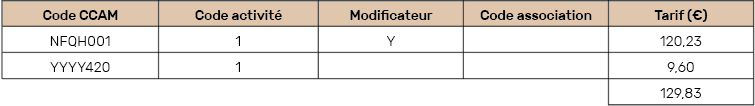 Le modificateur « Y » de 13 % est appliqué au tarif de l’acte d’arthrographie, NHQH001. Il est rappelé qu’il n’y a pas de code d’association à renseigner dans cette situation.