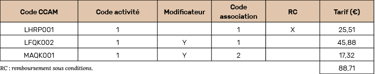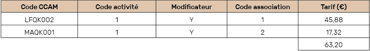 Au tarif de base de chacun de ces actes de radiologie a été appliqué le modificateur « Y », dont la valeur est de 13 %. L’acte radiologique, dont le tarif est le plus élevé, est noté en premier avec le code d’association « 1 » facturé à 100 %. Le second acte de radiologie est tarifé à 50 % avec le code d’association « 2 ». Le code d’activité est de « 1 » pour chacun de ces actes, l’acte étant réalisé par un seul professionnel de santé.