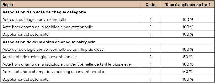Un ou deux actes de radiologie conventionnelle peuvent être associés à un ou deux actes hors champ de la radiologie conventionnelle (Tab. 4).