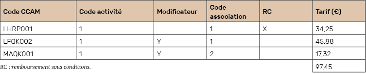 Comme précédemment, l’acte radiographique le plus cher est facturé en premier lieu avec le code d’association « 1 » et le second acte radiographique avec le code d’association « 2 ». On n’oublie pas l’application du modificateur « Y » à 13 %. L’acte non radiographique, ici LHRP001, est facturé à taux plein avec le code d’association « 1 ». La mention « X » fait référence au fait que l’examen est remboursé sous condition pour ce qui concerne l’indication et la formation spécifique en plus de la formation initiale, comme précisé dans l’annexe 1.