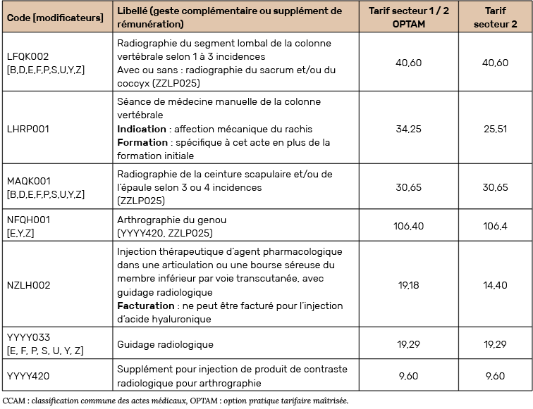 Exemple 3 – Radiographies du rachis lombaire (LFKQ002) et de l’épaule (MAQK001) avec une séance de médecine manuelle (LHRP001), rhumatologue secteur 1 ou secteur 2 OPTAM (option pratique tarifaire maîtrisée) (Tab. 5).