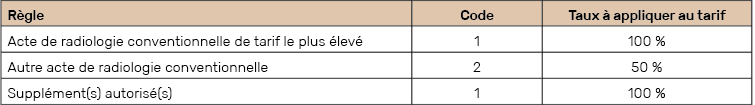 La règle générale s’applique désormais aux actes de radiologie conventionnelle, cette dernière est rappelée dans le tableau 2. En effet, au maximum deux actes de radiologie peuvent être facturés.
