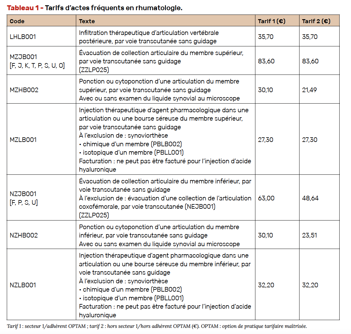 À titre indicatif est indiqué dans le tableau 1 le tarif de quelques actes fréquents en rhumatologie.