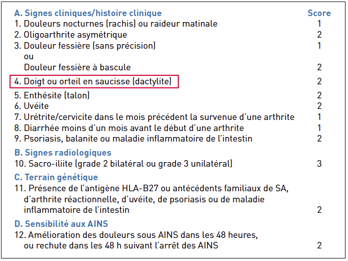 FIGURE 1 – Critères de classification de spondylarthrite d’Amor (Armor B et al. Rev Rhum Mal Osteoartic 1990 ; 57 : 85-9). Au moins 6 points sont nécessaires.