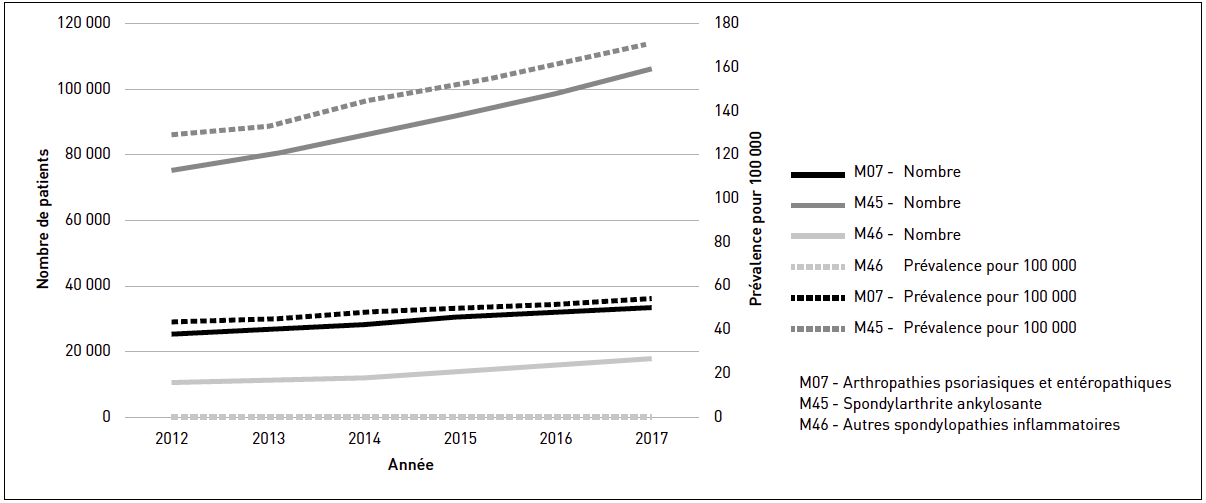 Il s’agit des statistiques des affections de longue durée (ALD) publiées régulièrement par l’Assurance maladie (1). Ce sont surtout les ALD n° 22 et n° 27, respectivement dédiées à la polyarthrite rhumatoïde (PR) et à la spondyloarthrite (SA), qui vont nous intéresser. Le nombre de patients en ALD PR et SA en 2017 (dernière année disponible) était respectivement de 217 110 et de 157 400 avec une augmentation respective de 23 % et de 41 % depuis 2012. La figure 1 dans la PR et la figure 2 dans la SA décrivent l’évolution 2012-2017 du nombre de patients et de la prévalence.