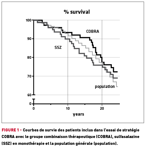 L’essai de stratégie COBRA (COmbinatie therapie Bij Rheumatoide Artritis) montrait qu’après 10 ans de suivi, cette mortalité diminuait dans le groupe combinaison thérapeutique (COMB) comparativement au bras sulfasalazine (SSZ) en monothérapie.