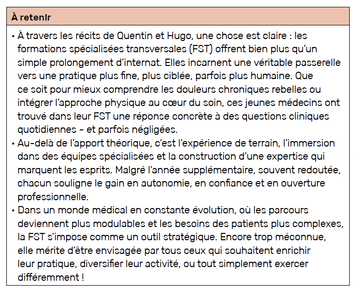 Ne pas hésiter à échanger avec des collègues qui ont déjà suivi la FST et à discuter avec les coordinateurs, qui sont généralement accessibles. La médecine de la douleur est passionnante et mérite d’être découverte.