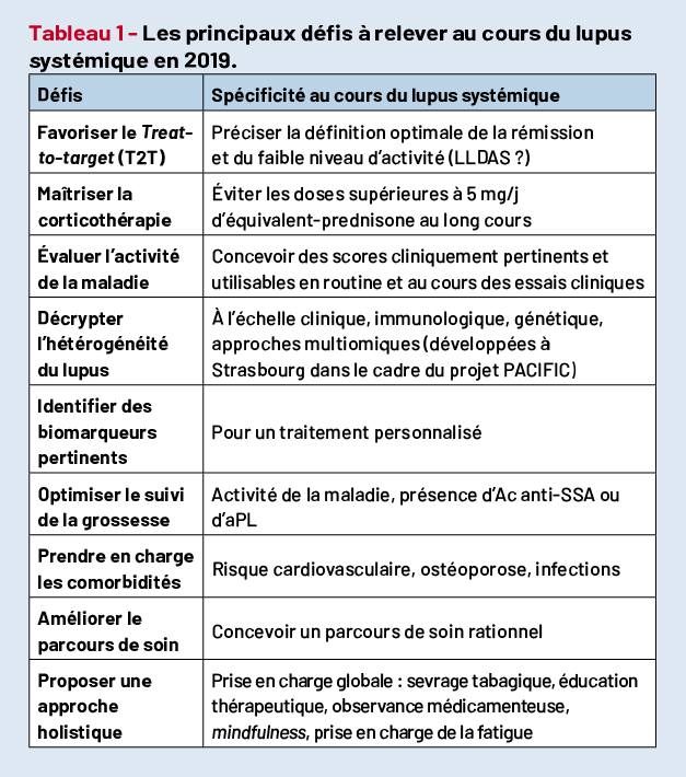 La première communication (Pr Laurent Arnaud) concernait les défis (Tab. 1) à relever dans la prise en charge du lupus en 2019, à partir d’une publication récente (1) du Centre national de référence (CNR) des maladies auto-immunes et systémiques rares de Strasbourg.