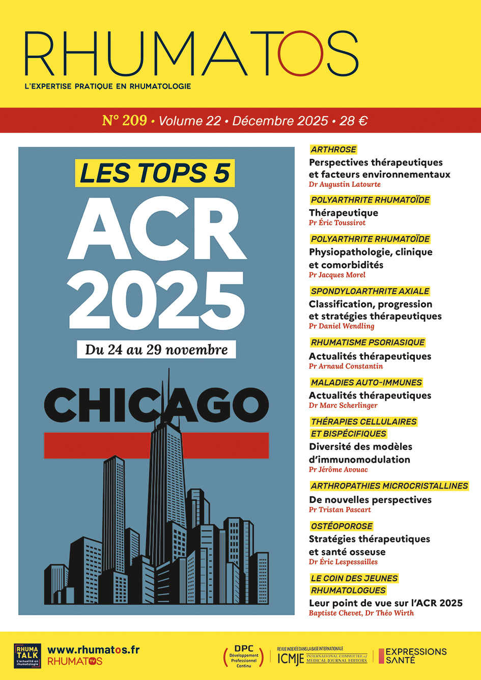• Actualités nationales et internationales de la rhumatologie • Rubrique spéciale post-congrès : EULAR, ACR, ASBMR, JNR, Viggo Petersen, Gesto’Rhumato, La Main Rhumatologique, Etats généraux de la Rhumatologie