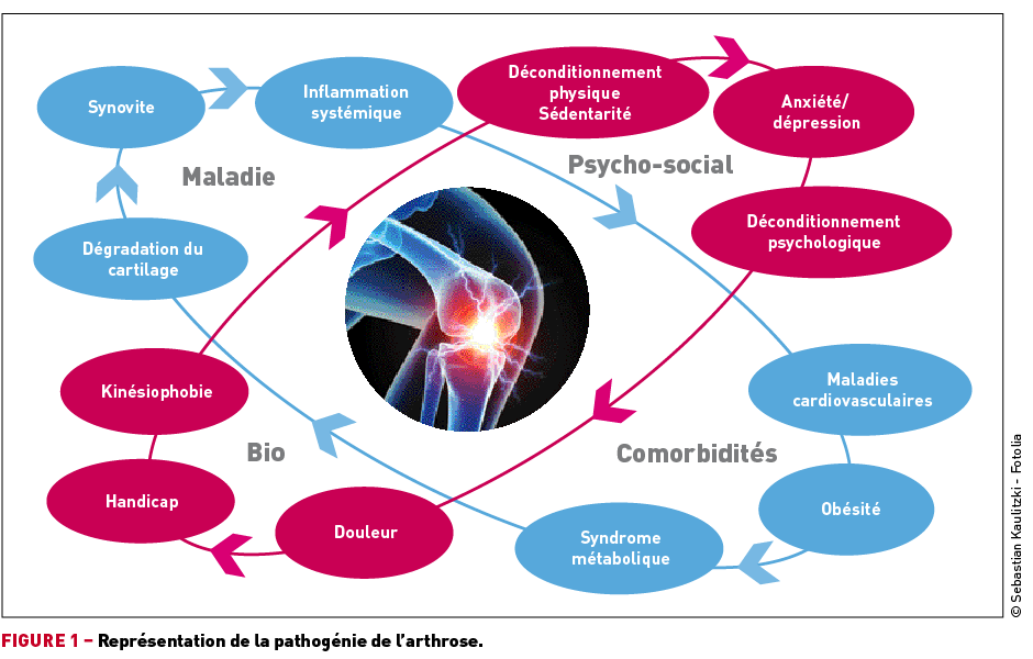 L’arthrose est une maladie globale de l’articulation synoviale caractérisée par la formation d’ostéophytes, un remodelage accru de l’os sous-chondral conduisant à la sclérose, une dégradation du cartilage articulaire et l’inflammation de la membrane synoviale (synovite). Les tissus périarticulaires, tendons, muscles, ligaments, contribuent également à la genèse et à la progression de la maladie avec la tendinopathie, la sarcopénie et la laxité ligamentaire.