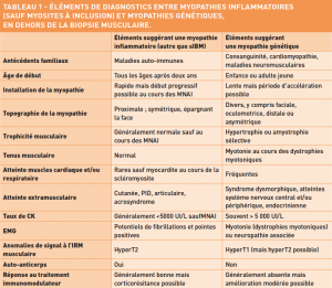 Parmi les autres éléments à analyser pour le diagnostic de l’origine auto-immune d’une myopathie (Tab. 1), deux sont particulièrement importants et pourraient permettre dans certains cas de se