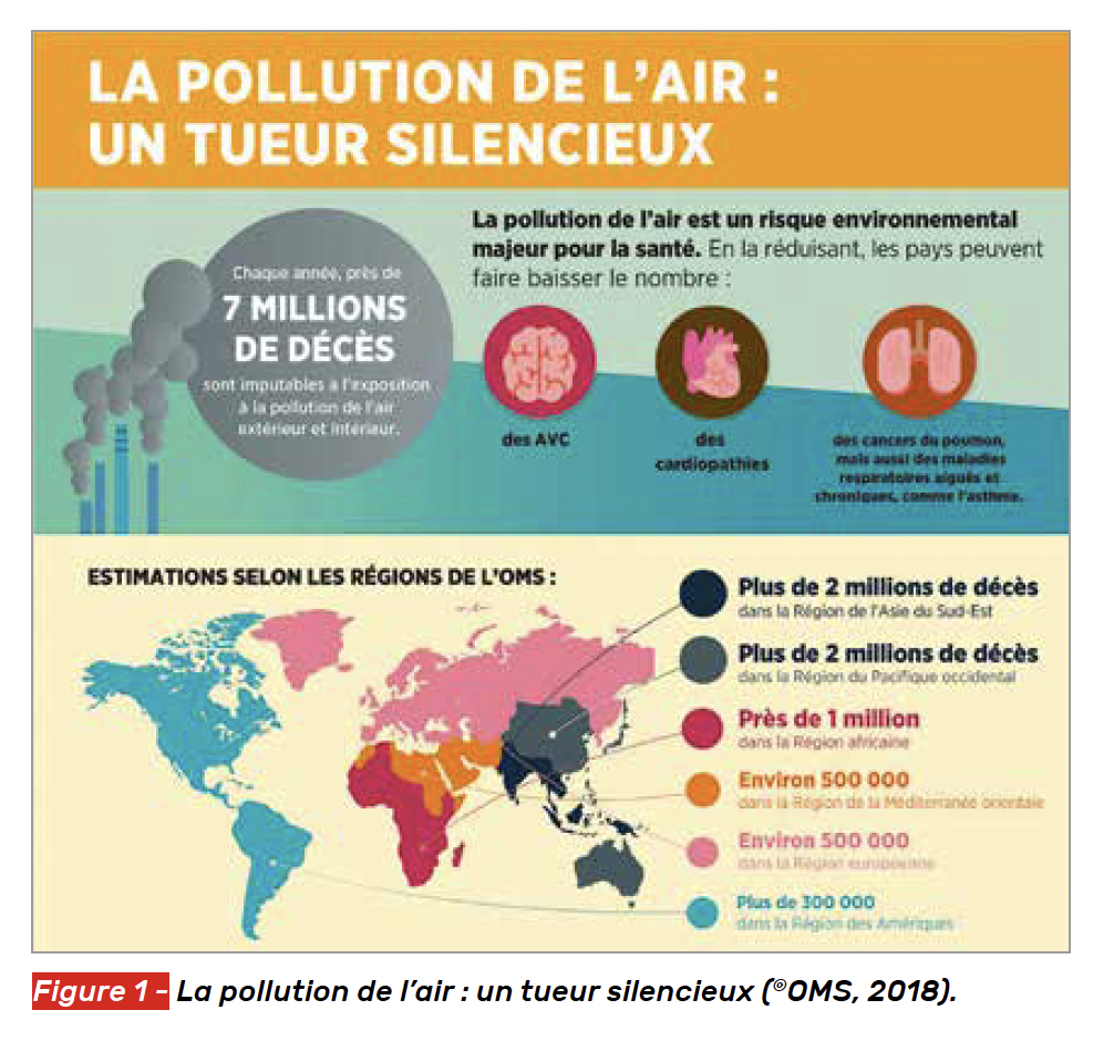 La pollution de l’air et la propagation de maladies infectieuses comptent parmi les principales menaces sanitaires exacerbées par le dérèglement climatique. L’Organisation mondiale de la santé (OMS) nous indique que 99 % de la population mondiale respire un air qui excède largement les limites qualitatives fixées en 2021 (4). La pollution de l’air (principalement les matières particulaires dites PM2.5) serait responsable globalement de 8,79 millions de décès (prématurés en 2015) (Fig. 1), soit 16 % des décès à l’échelle mondiale, ce qui représente trois fois plus de décès que le Sida, la tuberculose et le paludisme réunis (5, 6).