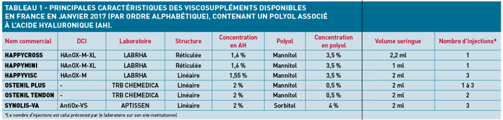 Les industriels se penchent sur les moyens possibles d’améliorer les performances de la viscosupplémentation dans le but d’obtenir un effet plus rapide, plus durable et plus marqué et ainsi couper court à toute polémique (Tab. 1).